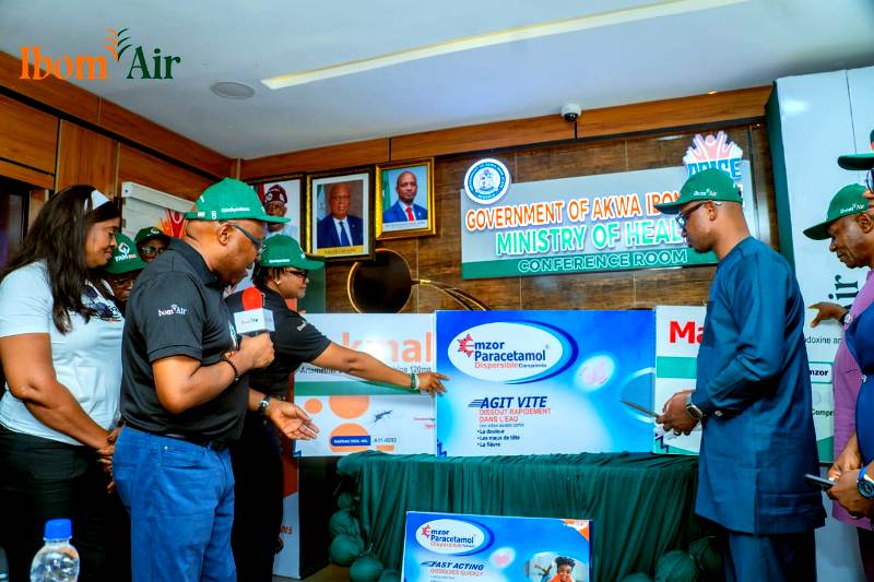 The donation of 30,000 doses of Sulfadoxine-Pyrimethamine, 10,000 doses of Lokmal DT, and 10,000 doses of Paracetamol DT to help augment the burden of malaria in affected communities was formally presented yesterday, April 24, 2026, one day ahead of the global observance by the CEO of Ibom Air, Mr. George Uriesi, who was accompanied by members of the Ibom Air management team. The presentation was received by the Akwa Ibom State Commissioner for Health, Dr. Ekem Emmanuel John, on behalf of the Government of Akwa Ibom State.